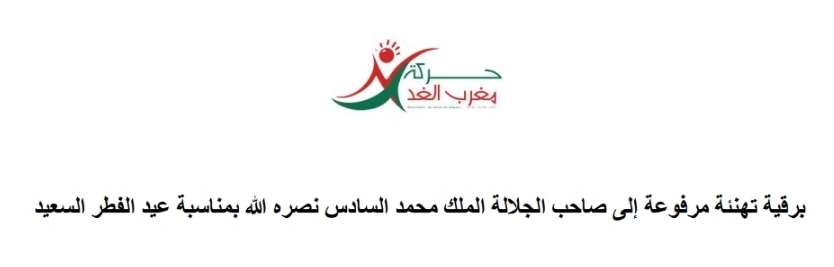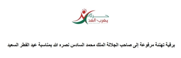 يسعدني و يشرفني، أصالة عن نفسي ونيابة عن كافة أعضاء المكتب التنفيذي ل”حركة مغرب الغد”، أن أتقدم إلى السدة العالية بالله، صاحب الجلالة الملك محمد السادس نصره الله أمير المؤنين و حامي حمى الوطن و الدين، بأعطر عبارات التهاني و أصدق تحيات التبريك بمناسبة عيد الفطر السعيد، سائلين المولى عز وجل أن يهله على جلالتكم، و على سائر أفراد الأسرة الملكية الشريفة بموفور الصحة و العافية و السعادة و التوفيق، و لما فيه خير مغربنا العزيز، و ان يديم علينا ،تحت قيادتكم الحكيمة نعم الاستقرار و الاصلاح الامن و الطمأنينة.